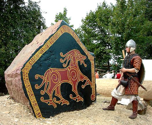 Wolin / Polen. Crysagon vor dem Runenstein aus dem Jahr 2001