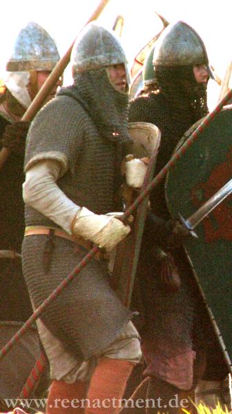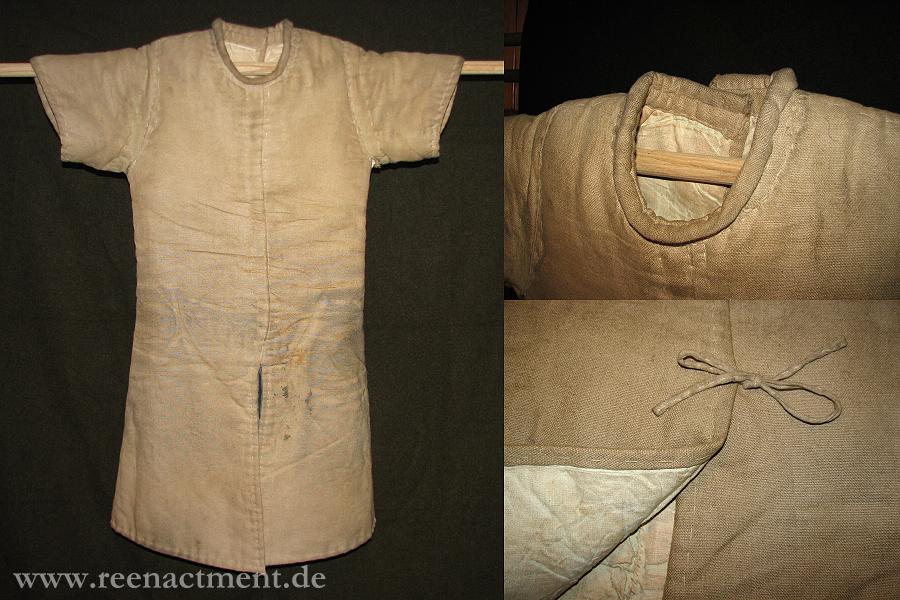 besonders gefährdeten Bereich. Der Gambeson wird auf dem Rücken mittels Leinenschnüren verschlossen. Diese bieten einem Kettenhemd die geringste Angriffsfläche. Schnallen aus hartem Material verhaken sich leicht und drücken
