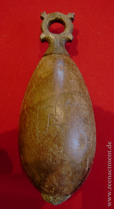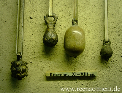Beschreibung: Es wurden viele solcher Waffenköpfe gefunden. Jedoch stehts ohne Befestigung. Daher ist ihr genaues Aussehen unsicher. Es gibt Exemplare aus Geweih und aus Bronze. Anders als dieses Exemplar sind die anderen aus Geweih sehr schlicht (siehe Bilder unten). Zumeist Kugel- oder Ei-förmige Köpfe mit Loch oder unverzierter Eisenhalterung.