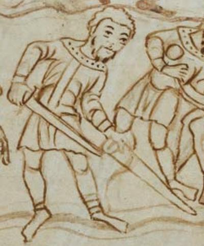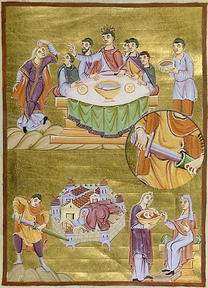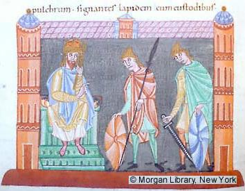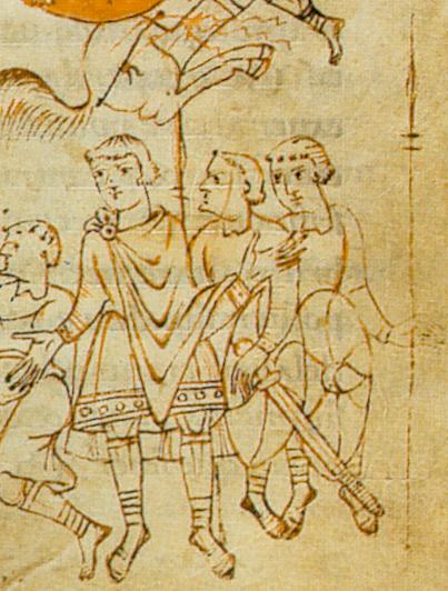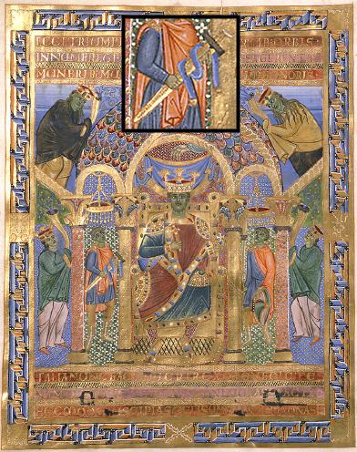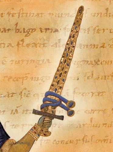 aus der Merowingerzeit bekannten metallenen Durchzüge existieren im 11. Jhd nicht mehr. Die Methode, den Schwertgurt kreuzförmig um die Scheide zu binden, taucht erst im 12. Jhd auf. Abbildungen des 11. Jhd zeigen