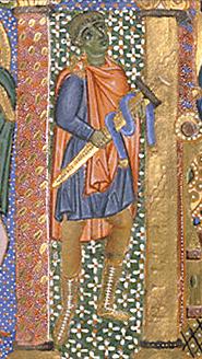 des sog. “Reichsschwerts” oder “Mauritiusschwerts”. Das Schwert datiert um 1200 und die dazugehörige Scheide um die Mitte des 11. Jahrhundert. Der Gurt für das Reichsschwert besteht aus Stoff (Seide und