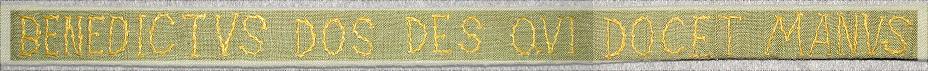 Goldfäden) und schmückt sich ebenfalls mit einem Spruch. Dieser ist, genau wie die übrigen Verzierungen, eingewebt. Der Gurt war ursprünglich sehr bunt, rot grün braun und hellblau. (2)