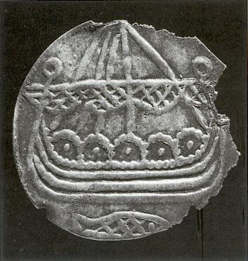 Beschreibung: In Haithabu geprägte Münze. Sie zeigt vermutlich ein königliches Kriegsschiff in Bereitschaft.