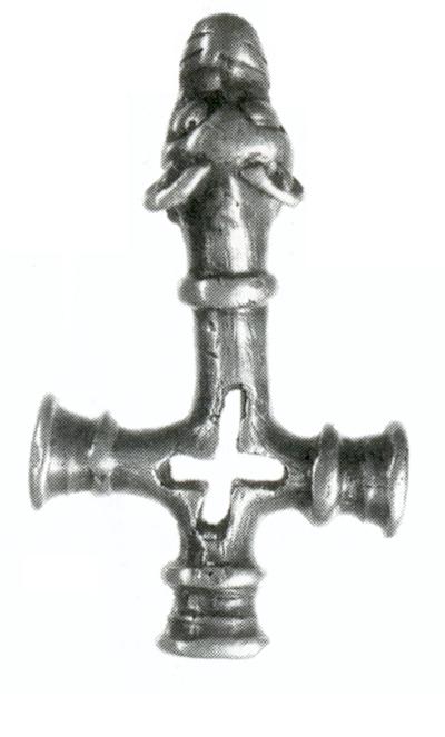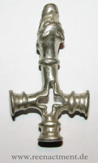 Beschreibung: Vermutlich eine Kombination aus Kreuz und Thorshammer. Öse in Form eines Tierkopfes.