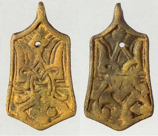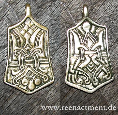 Beschreibung: Trapezförmiger Anhänger mit dem Zeichen des Rurik, Bronzeguß