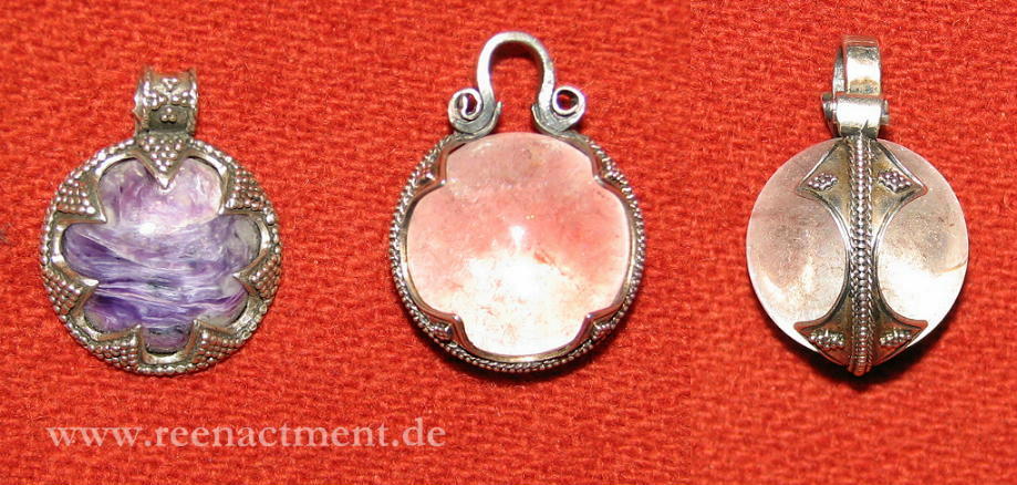 Kristallanhänger. Links ein Amethyst und rechts Bergkristall. Die Fassungen sind aus Silber und granuliert. Solche Stücke wurden u.a. auf der Insel Gotland (Schweden) gefunden und werden in das 11. bis 12. Jahrhundert datiert. Siehe: Wikinger Waräger Normannen, Die Skandinavier und Europa 800-1200, Ausstellungskatalog, Staatliche Museen zu Berlin 1992, ISBN 87-7303-559-9, Seite 382 |